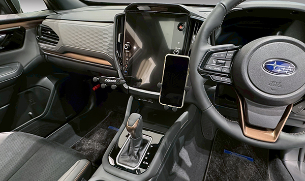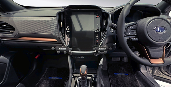 車種別専用設計した可変軸式ベース・ブラケットに片手操作で上から差し込むだけで「シュっ」と固定できる市販品の重力式ホルダーを標準セットとしています(面倒な開閉やロック&解除の操作は不要です)