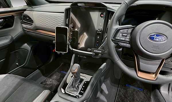 車種別専用設計した可変軸式ベース・ブラケットに片手操作で上から差し込むだけで「シュっ」と固定できる市販品の重力式ホルダーを標準セットとしています(面倒な開閉やロック&解除の操作は不要です)