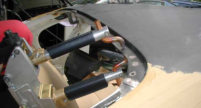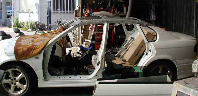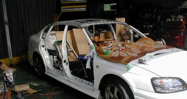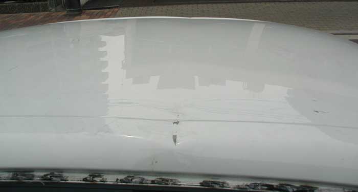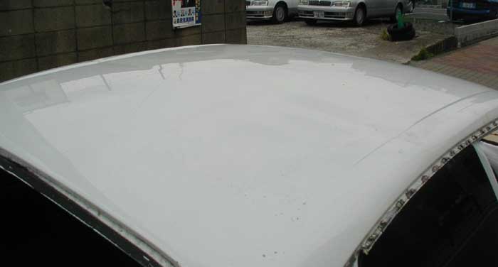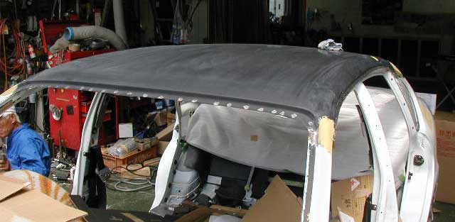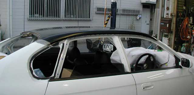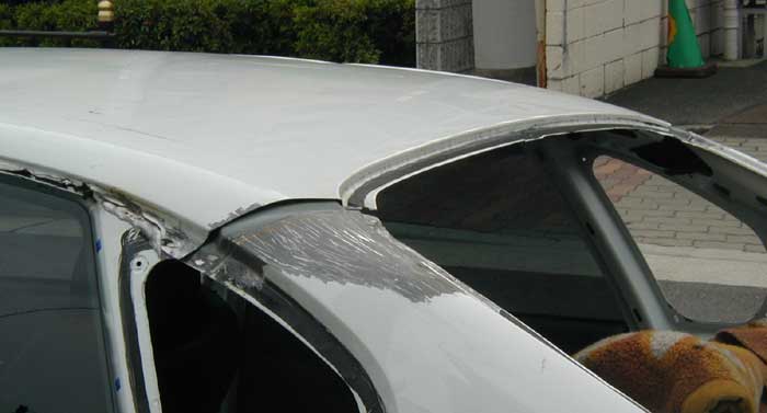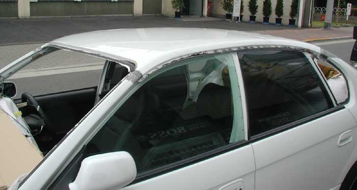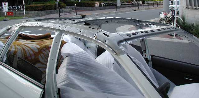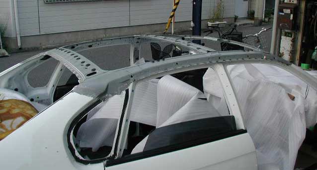 | ・・・駐車リフトに挟まれ痛々しい姿に。画像では判りにくいですがコストに見合わないので鈑金修理は不可のレベルです。尚このレベルのルーフ破損でも運悪くリアガラスは割れ、左右クォーターパネルに歪が生じています。 、、、と言う事で最悪クォーターパネルの交換作業も入ることも有ります。 (弊社では車の将来?と コストを考え、何でもかんでも換えずに鈑金の方が分が有ると考えれば極力鈑金をお勧めしてますがします) 下の画像では既に粗出し作業は終り、真鍮溶接とスポット溶接を剥し始めているところですが。ルーフ交換作業にあたり、貼り付けガラス4枚は全て剥さなくてはなりません、またこの画像の後の作業で、全てのドアやシート、、、その他パーツも外して作業に移ります。 |