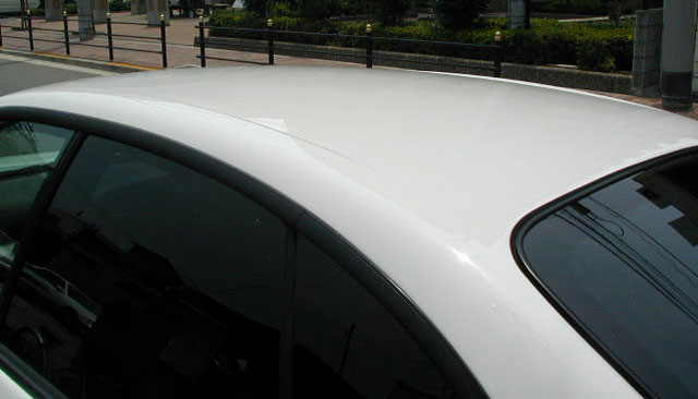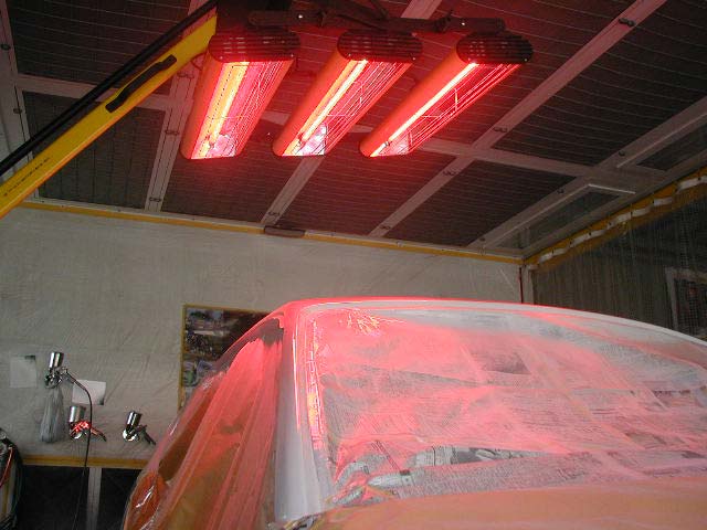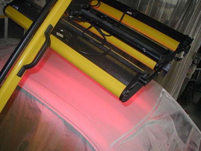 流石にルーフ等は一度に焼き付けることは出来ないので、順番に切れ目無く焼付作業します。一箇所辺り一順目「弱」で15分「強」で20分。二順目「弱」で20分「強」で25分とじっくりと時間を掛けて作業します。因みに下の画像は弱です(表面温度45度前後)